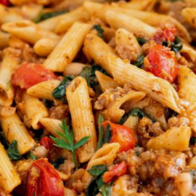 Home-,made pink sauce with crushed red pepper, Italian sausage, Bell Pepper, Onion, Garlic and Basil